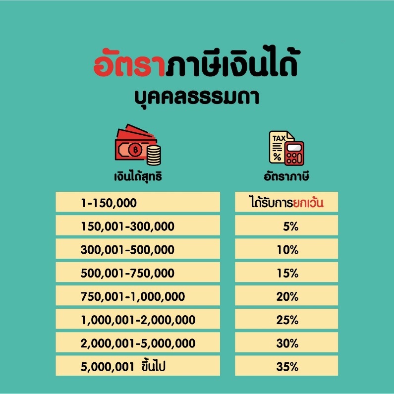 (อัตราภาษีจะเพิ่มขึ้นเรื่อยๆ จนถึงสูงสุดที่ 35% สำหรับเงินได้สุทธิเกิน 5 ล้านบาท)
