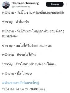 พนักงาน – วันนี้วันพระใหญ่เขาห้ามขาย ผิดกฎหมายน่ะค่ะ